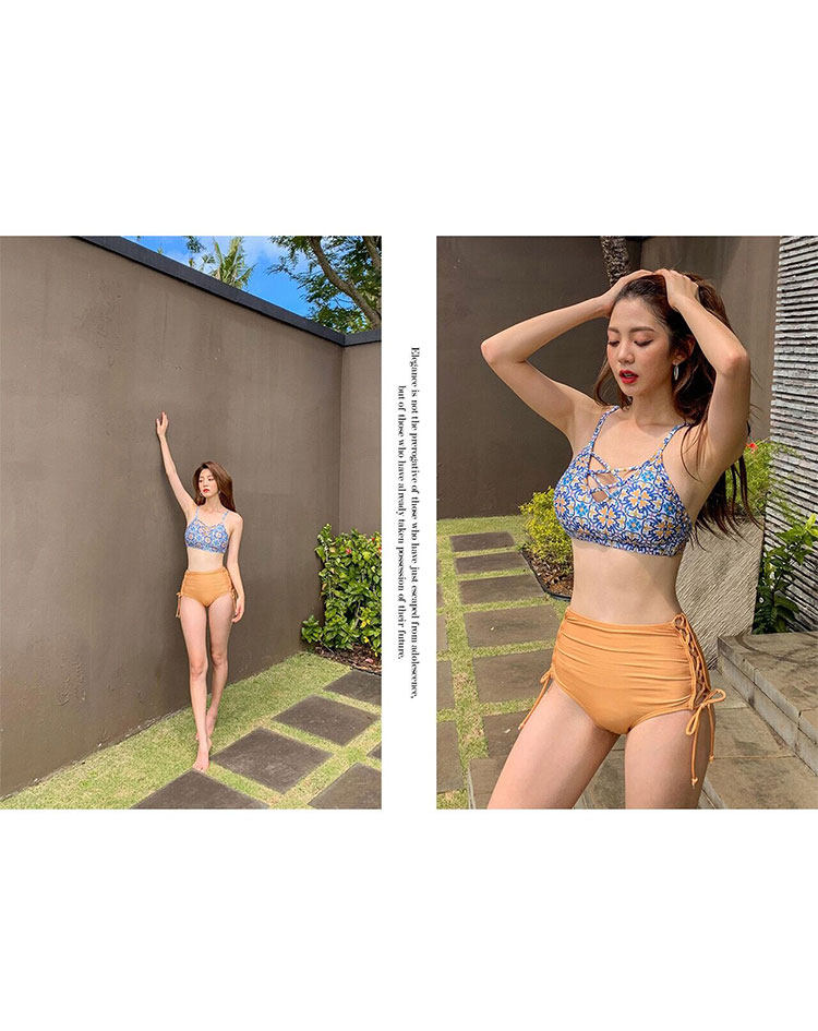 리얼 샷 한국 2019 새로운 섹시 스플릿 비키니 작은 가슴 모여 높은 허리 배꼽 얇은 온천 수영복 여성