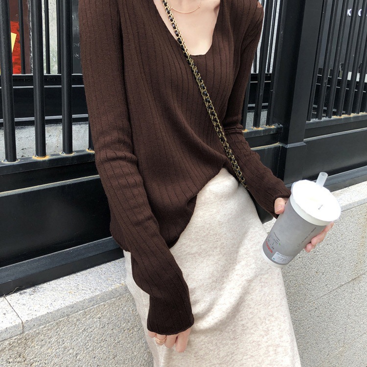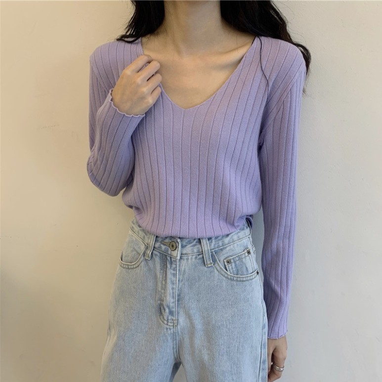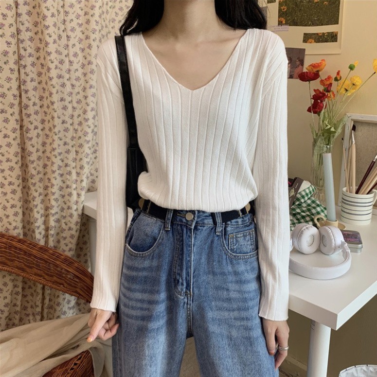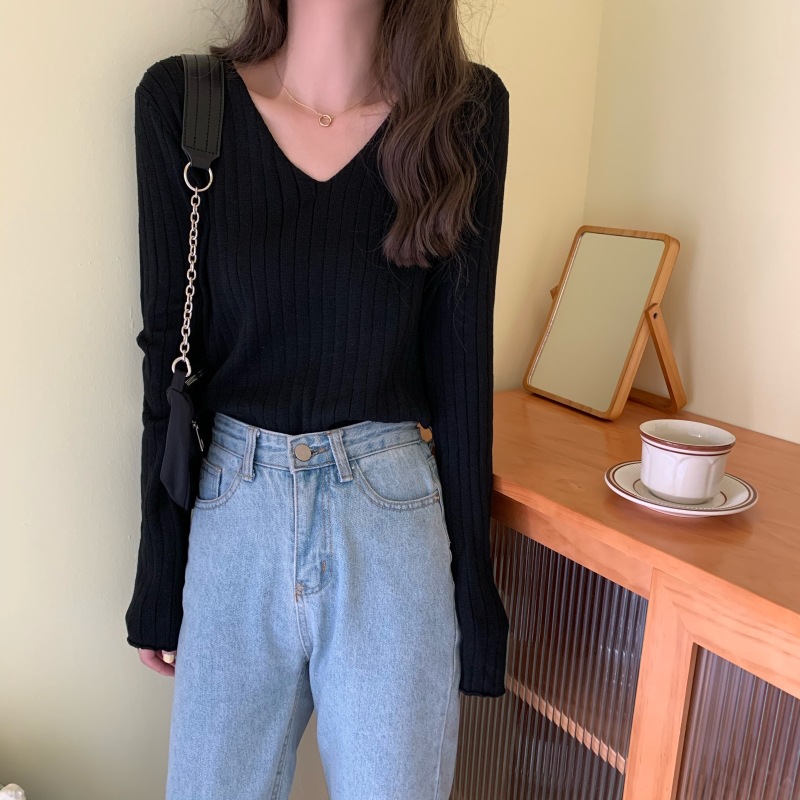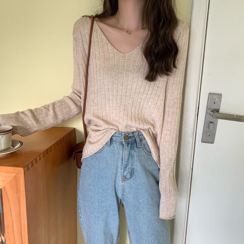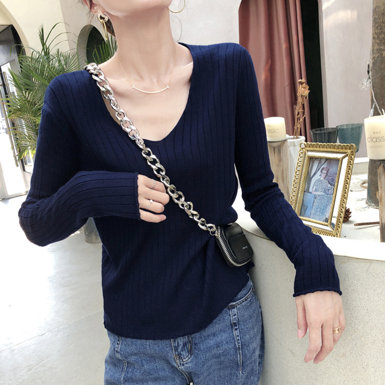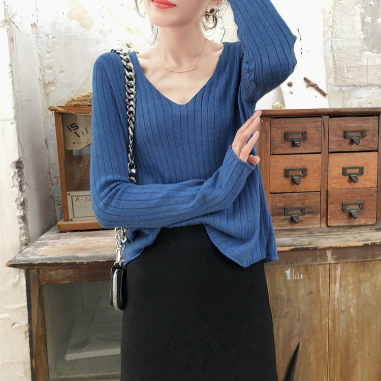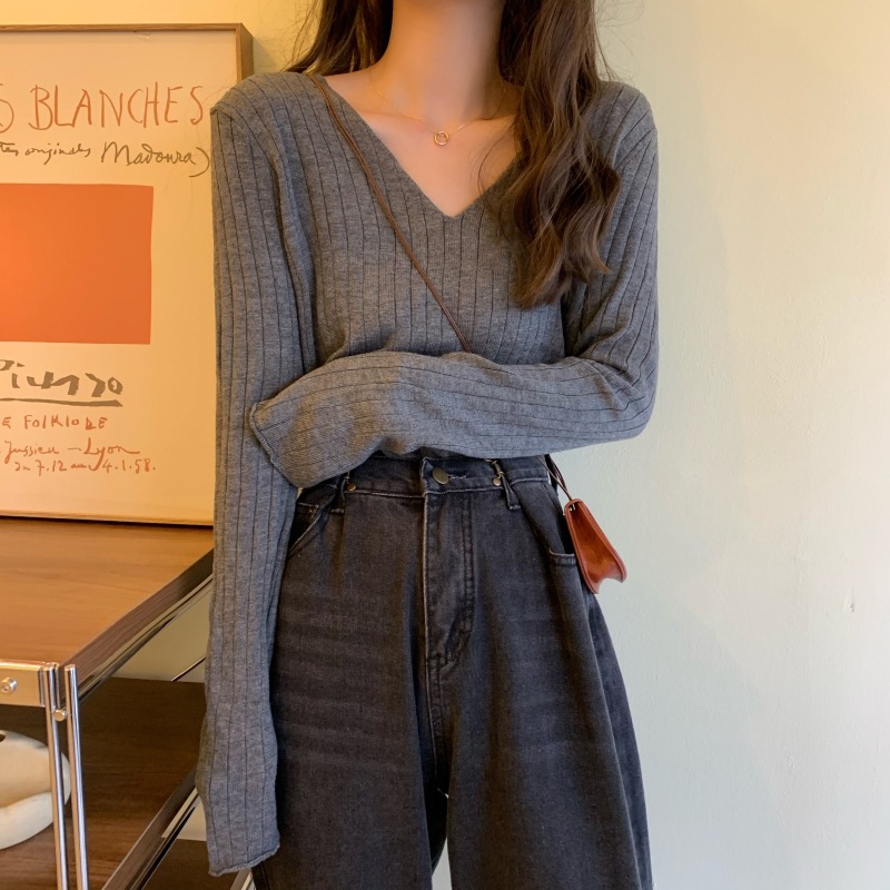 2024 년 가을과 겨울을위한 코어 스핀 원사 탑 여성 의류 새로운 한국 풀오버 V 넥 단색 기본 셔츠 긴 소매 스웨터스토어 가기