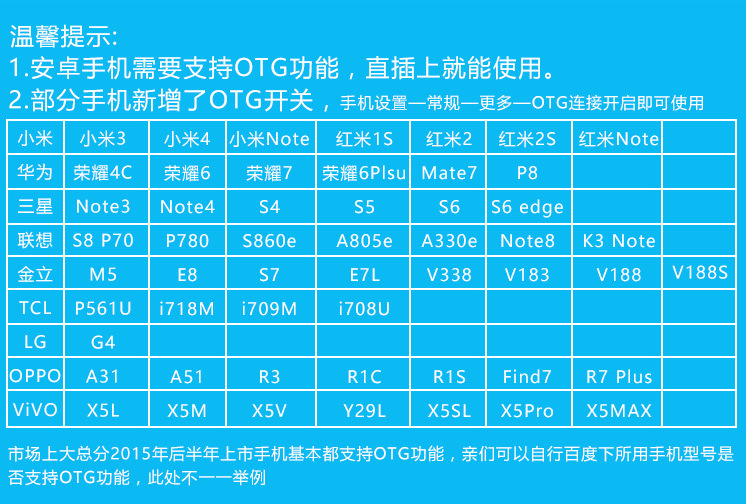 安卓的需要手机支持OTG功能方能使用,并非产品问题。不在此列表的机型亲们可以自行百度查一下,在此就不一一列举啦。