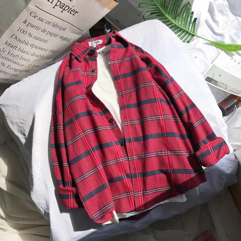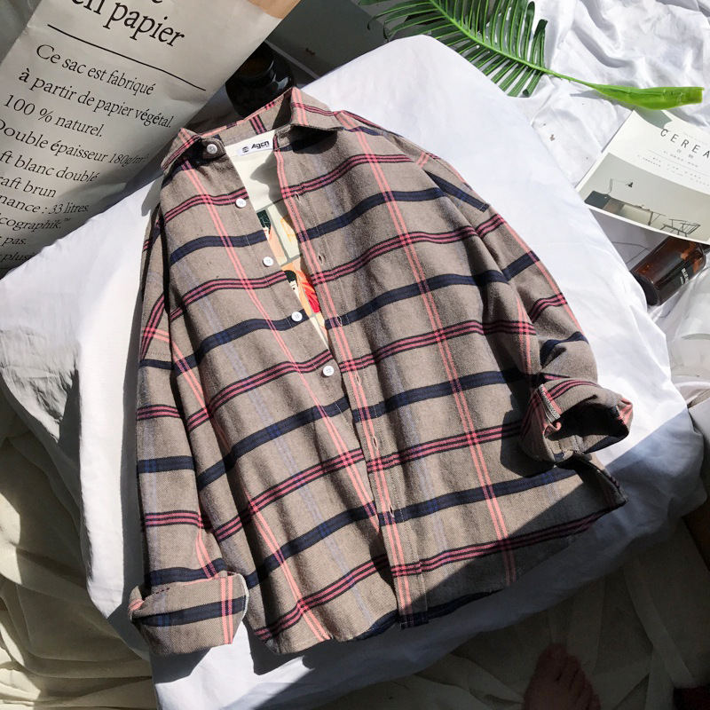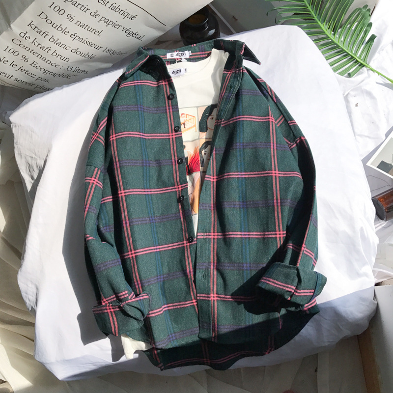 일본 봄과 가을 새로운 격자 무늬 셔츠 남자의 긴팔 한국 스타일 신선한 세련된 셔츠 bf 느슨한 복고풍 셔츠스토어 가기