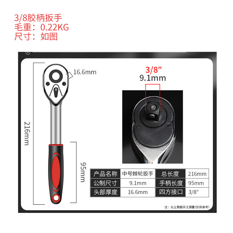 3/8轻款棘轮扳手后盖为塑盖,重量约0.22kg