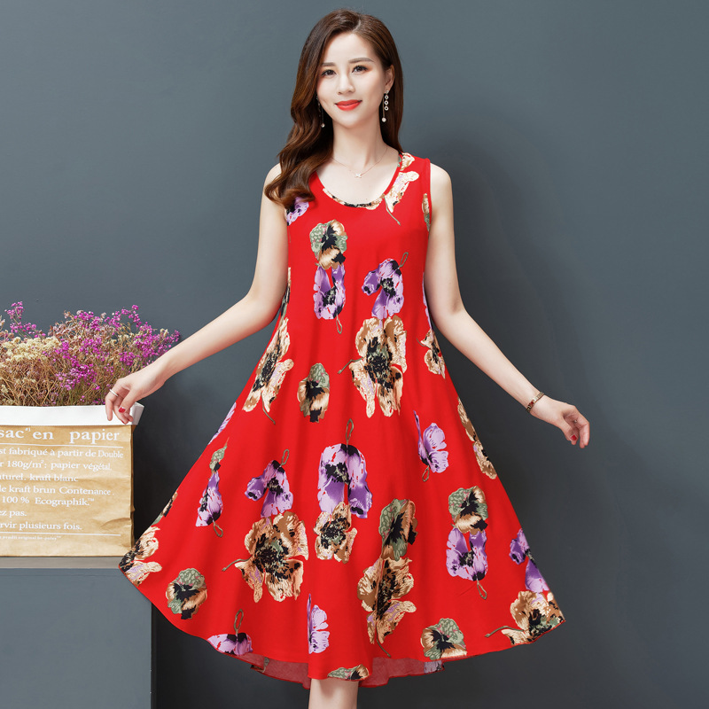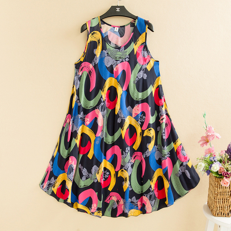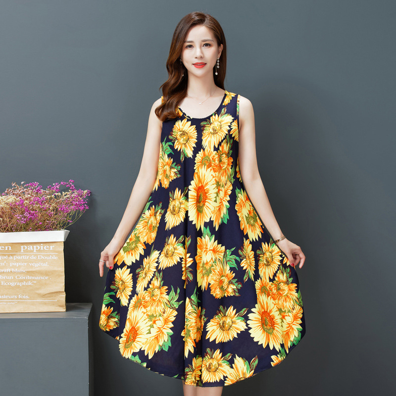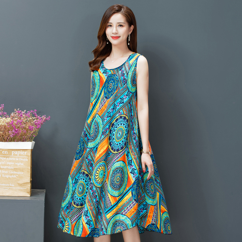 플러스 사이즈 면 실크 조끼 원피스 여름 원피스 새로운 민족 스타일 여성의 예술적 복고풍 인쇄 민소매 긴 원피스