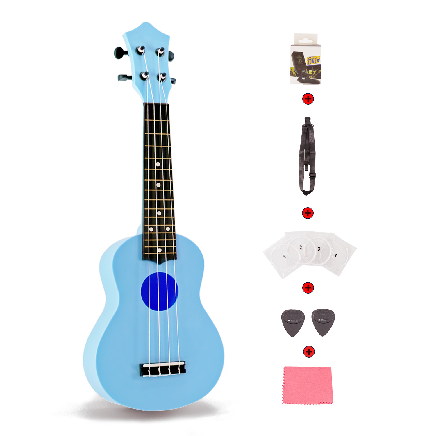 包裹内容:1*21寸塑料尤可里里蓝色套装,1*蓝色包包1*可调节背带黑色,2*拨片,1*尤可里里尼龙琴弦白色,1*调音器,1*擦琴布