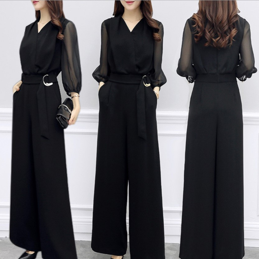봄과 여름 새로운 하이 웨이스트 쉬폰 점프 슈트 블랙 크롭 슬리브 슬림핏 슬리밍 우아한 와이드 레그 점프 슈트 세트 여성