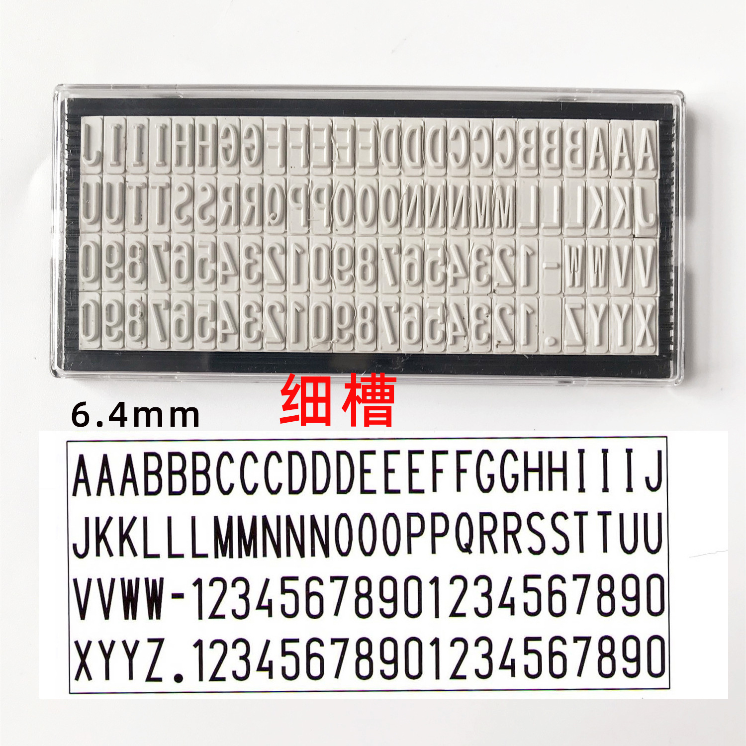 字高6.4mm 字粒共100字,包含A-Z大写字母以及0-9数字还包含 . -两个符号