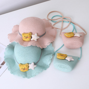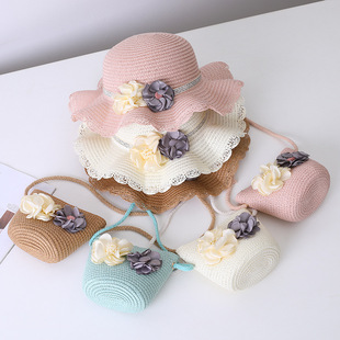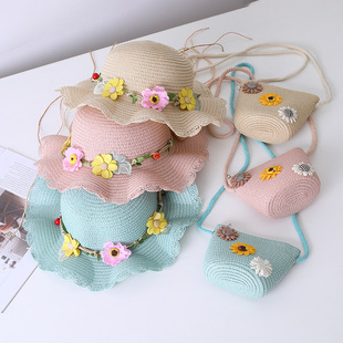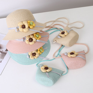 새로운 어린이 자외선 차단제 공주 비치 모자 차양 모자 소녀 밀짚 모자 태양 모자 체리 어부 모자 + 작은 가방