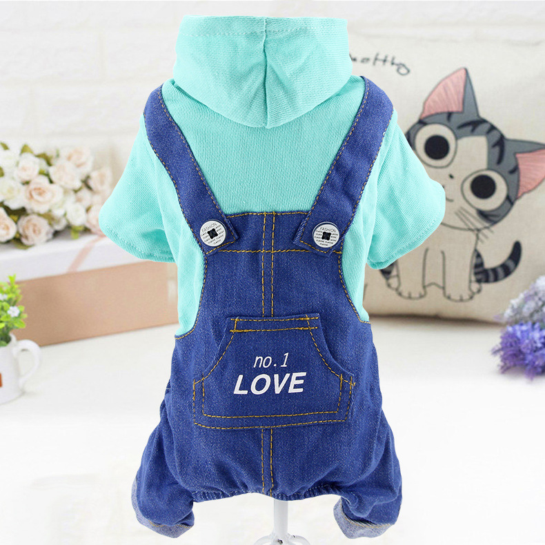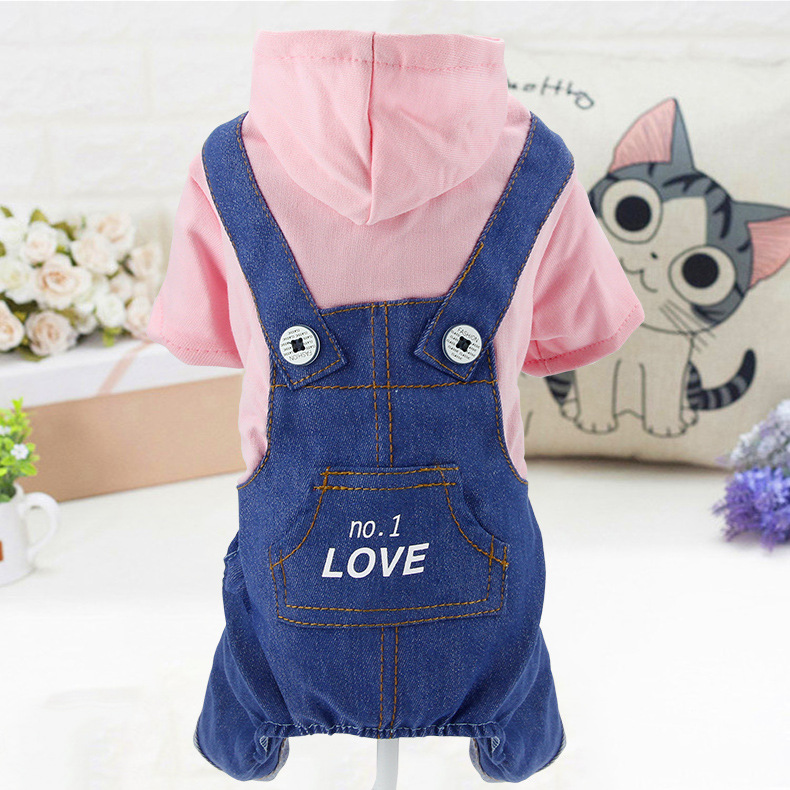 애완 동물 의류 개 봄과 가을 스트랩 데님 세트 네 다리 옷 편지 인쇄 테디 강아지 의류스토어 가기