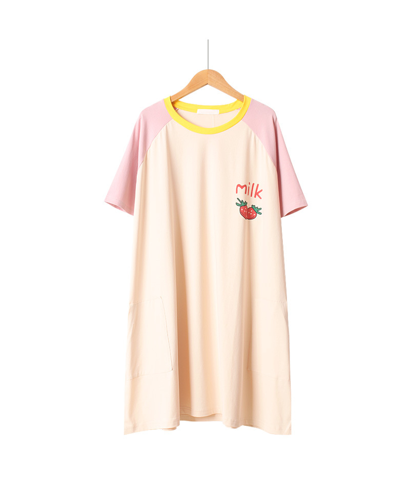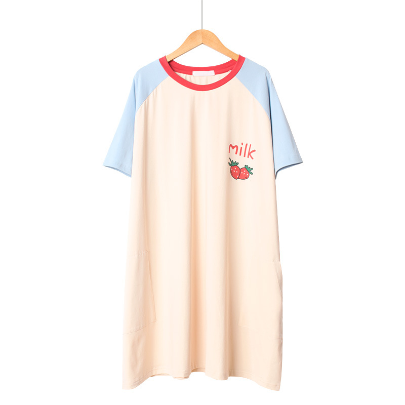 여름 캐주얼 한국 스타일 가정 의류 우유 딸기 달콤한 잠옷 느슨한 플러스 사이즈 라운드 넥 중간 길이 반팔 여성 잠옷스토어 가기