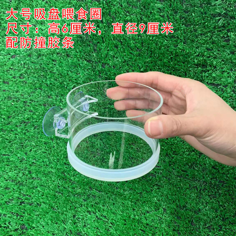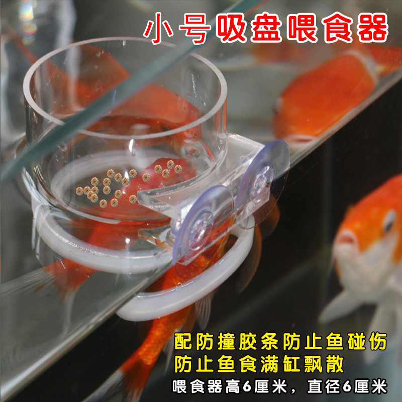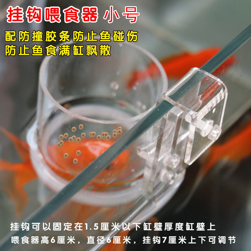 小号挂钩圆形喂食器:挂钩长7厘米上下可调节,可挂1.5厘米缸壁厚度,高6厘米6厘米直径。