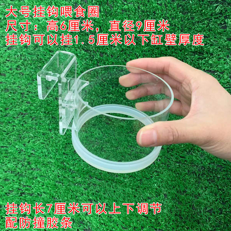 大号挂钩圆形喂食器:挂钩长7厘米上下可调节,可挂1.5厘米缸壁厚度,高6厘米9厘米直径。