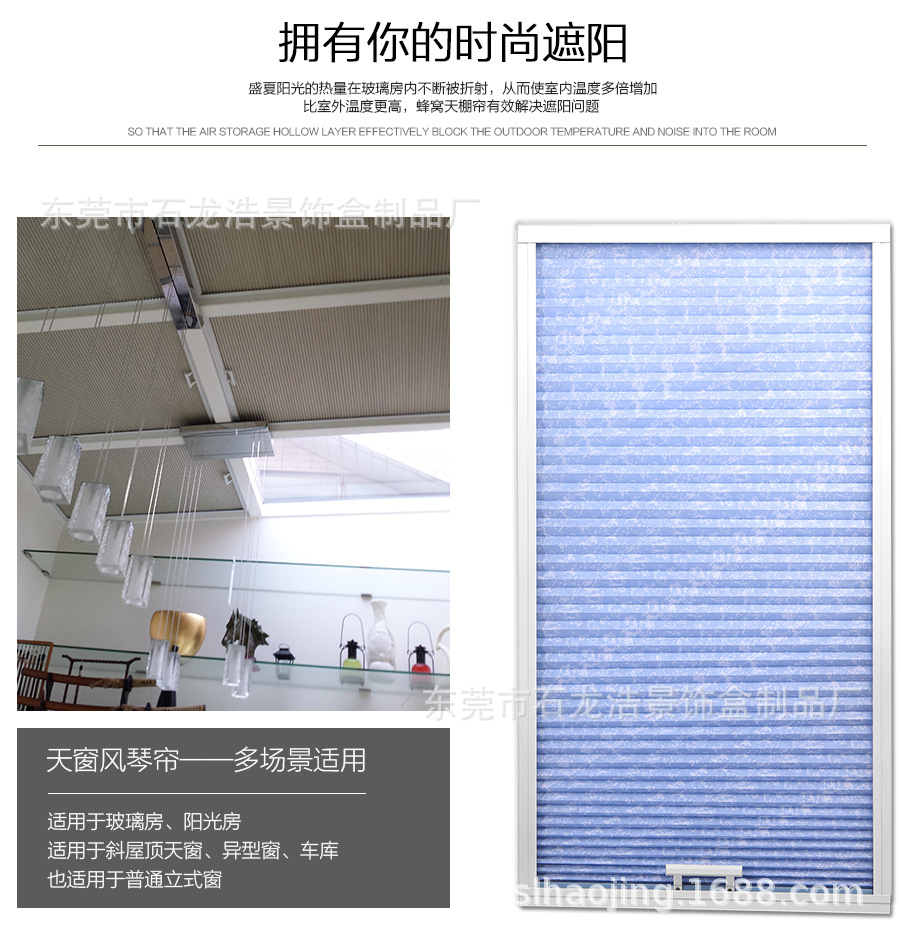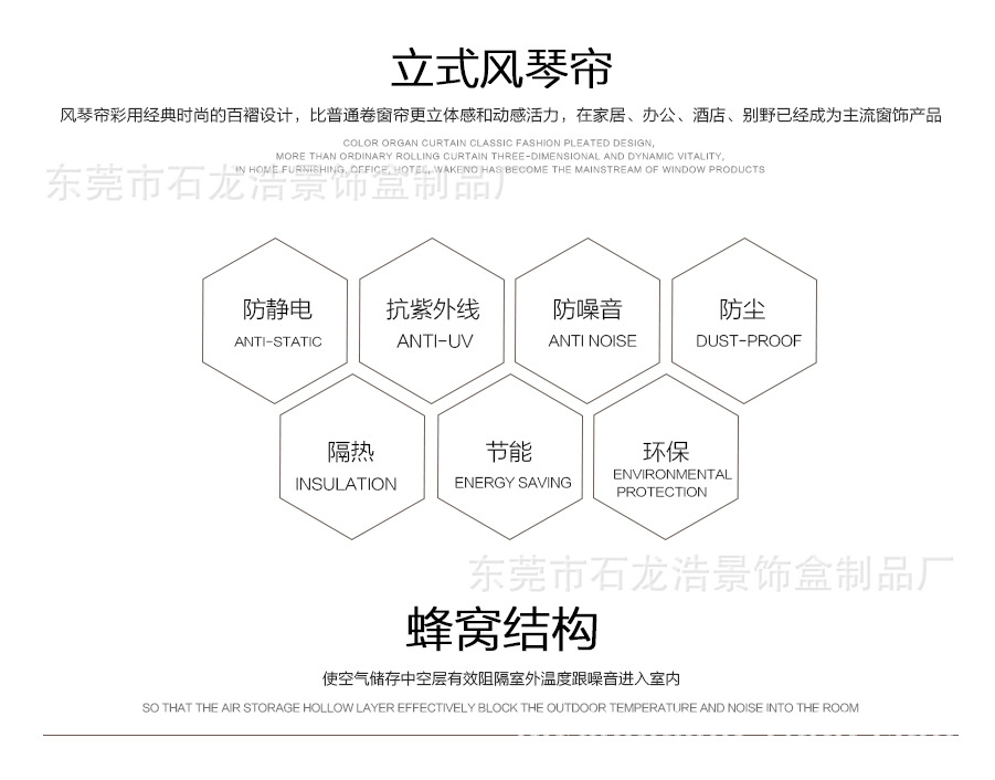 蜂巢帘,的蜂巢设计,使空气存储中空层,令室内保持恒温,可节省空调电费。其防紫外线和隔热功能有效保护家居用品,防静电处理,洗涤容易。