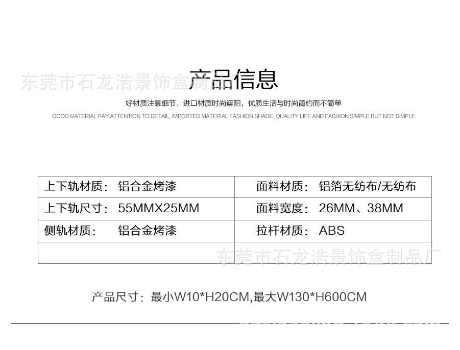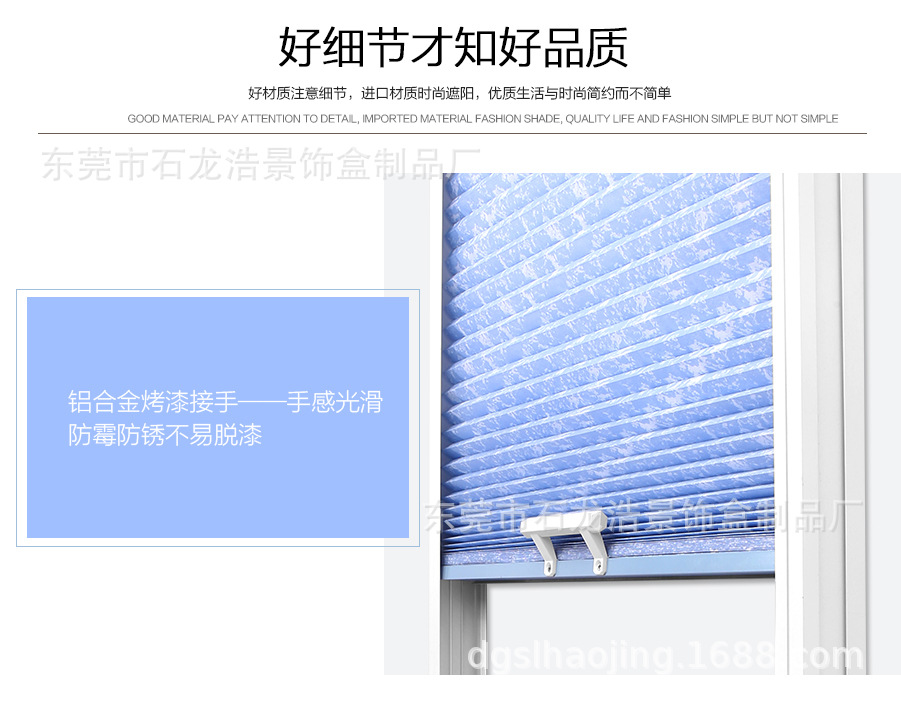 选用欧美进口物料,透光、遮光及多种颜色选择,简约设计意念,折合起来占空间极少,不阻碍视线。