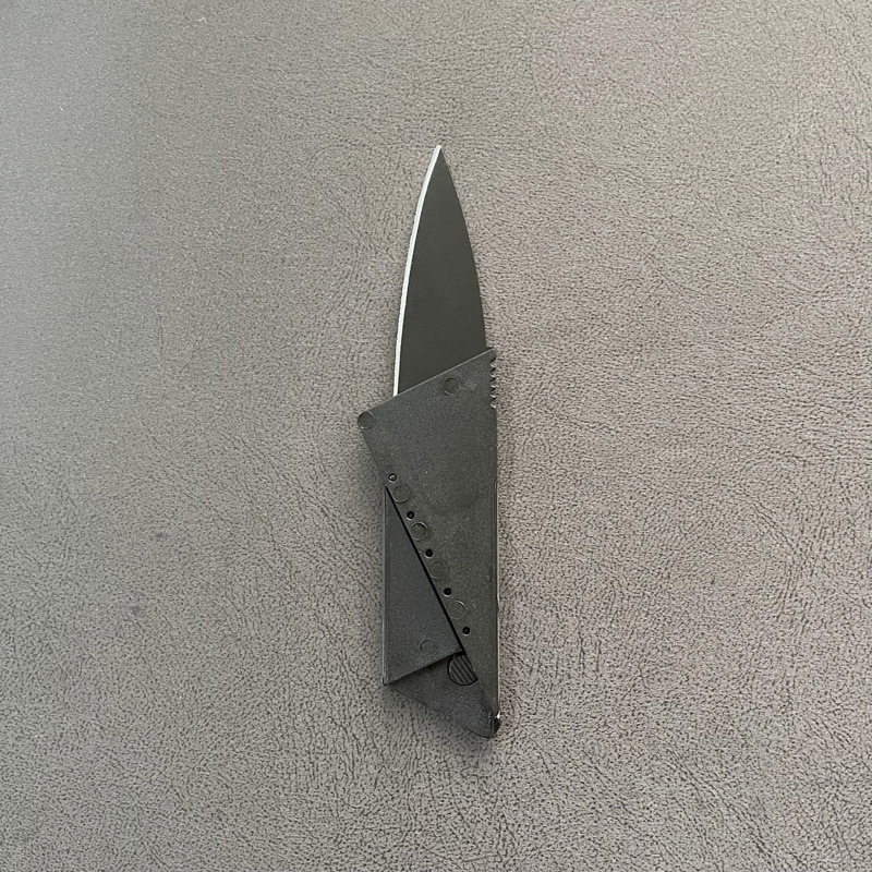 大小和一张信用卡相当。刀刃极其锋利,但本身却很轻薄。不用的时候可以将它折叠包裹在卡片式刀鞘中以防止被割伤。