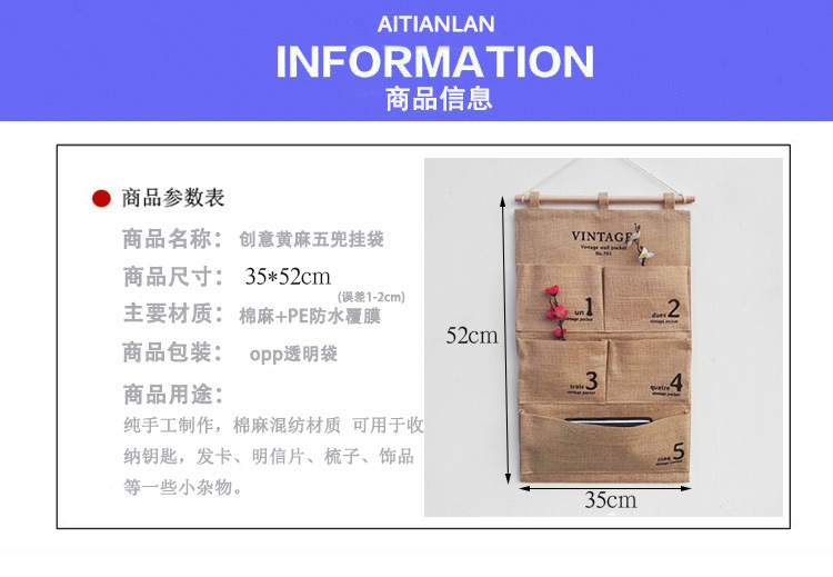 ZAKKA 면과 린넨 예술적 간단한 황마 향수 벽 다용도 보관 교수형 가방 도매 멀티 포트 보관 가방 도어 리어