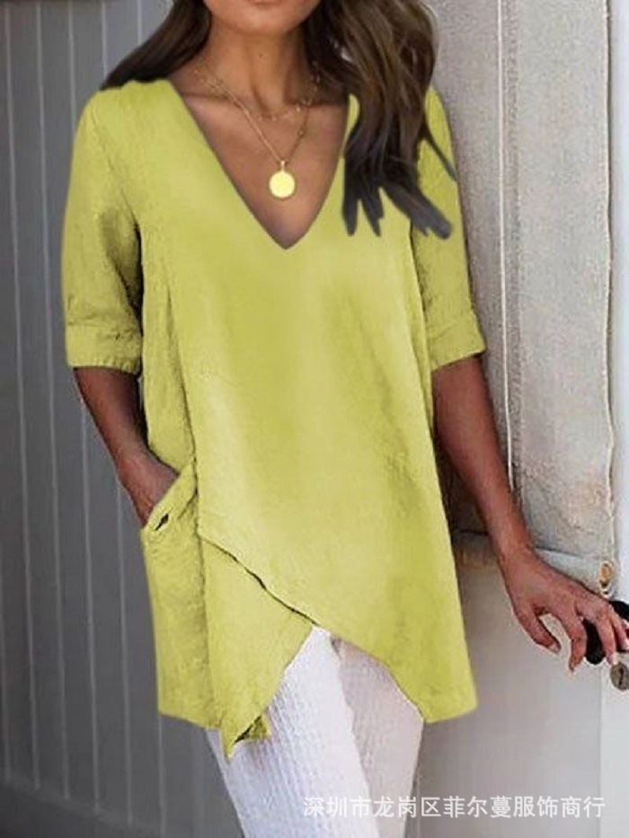아마존 유럽과 미국 크로스 보더 여성의 AliExpress 소원 여름 불규칙한 캐주얼 티셔츠 새로운 V-넥 하프 슬리브 탑