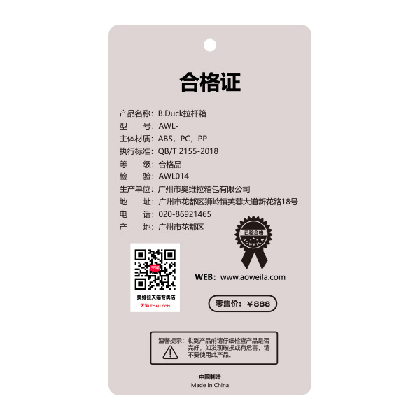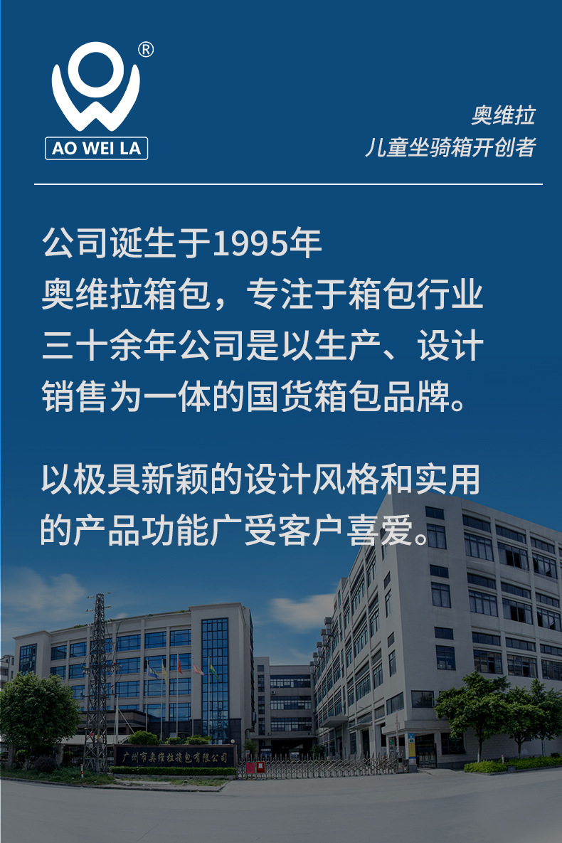 广州奥维拉箱包有限公司是一家集开发、生产、销售为一体的上规模民营企业。自有品牌“AOWEILA”,公司人数300人,工厂面积50000平方米。本公司有板材机,吸塑机,注塑机,等模具开发设备,生产行李箱、拉杆箱、PC 拉杆箱、电脑包、公文包、背包、箱包、旅行箱、拖轮包、休闲包、拉杆、轮子、手把配件等产品专业生产企业。公司拥有完整的科学质量管理体系。其诚信、实力以及产品质量获得业界的认可和赞誉。