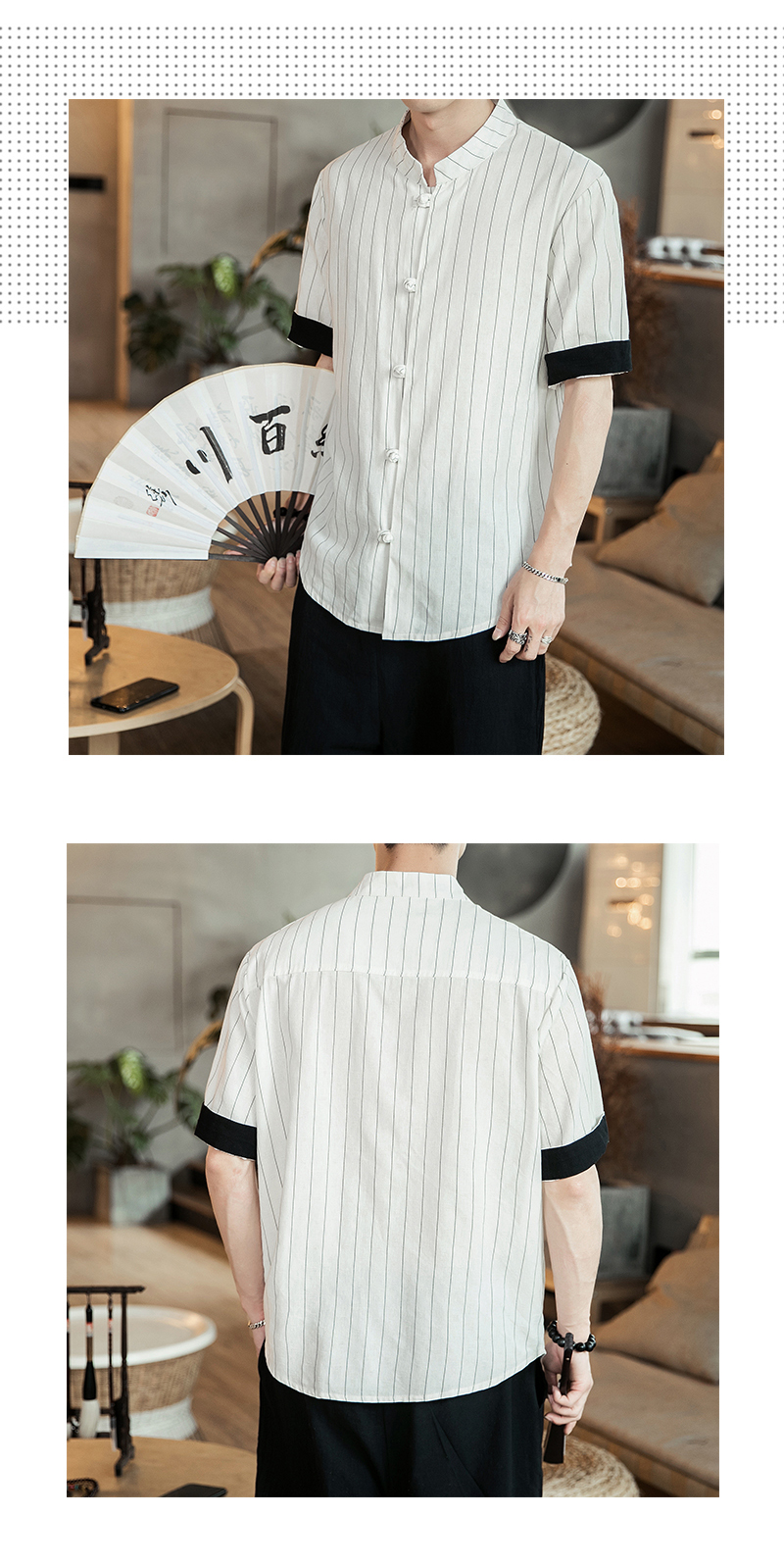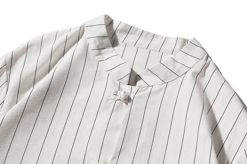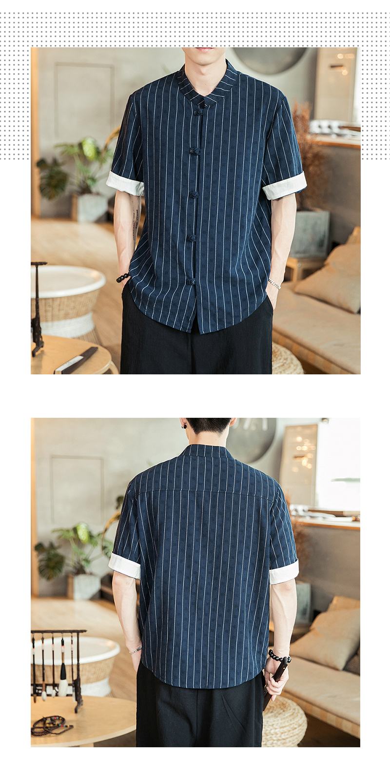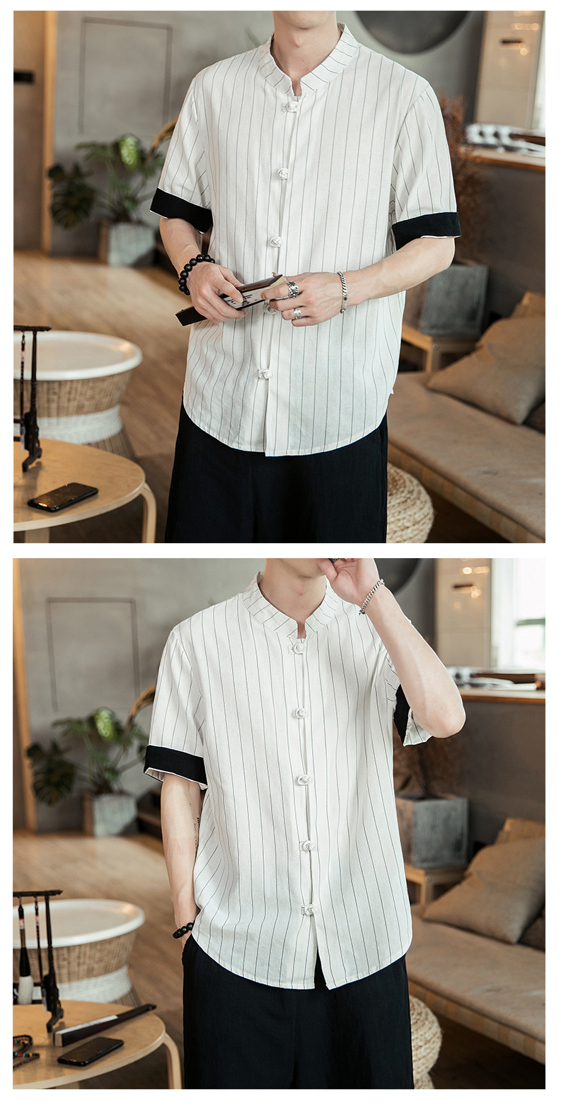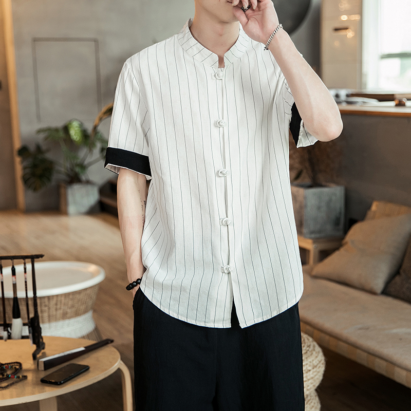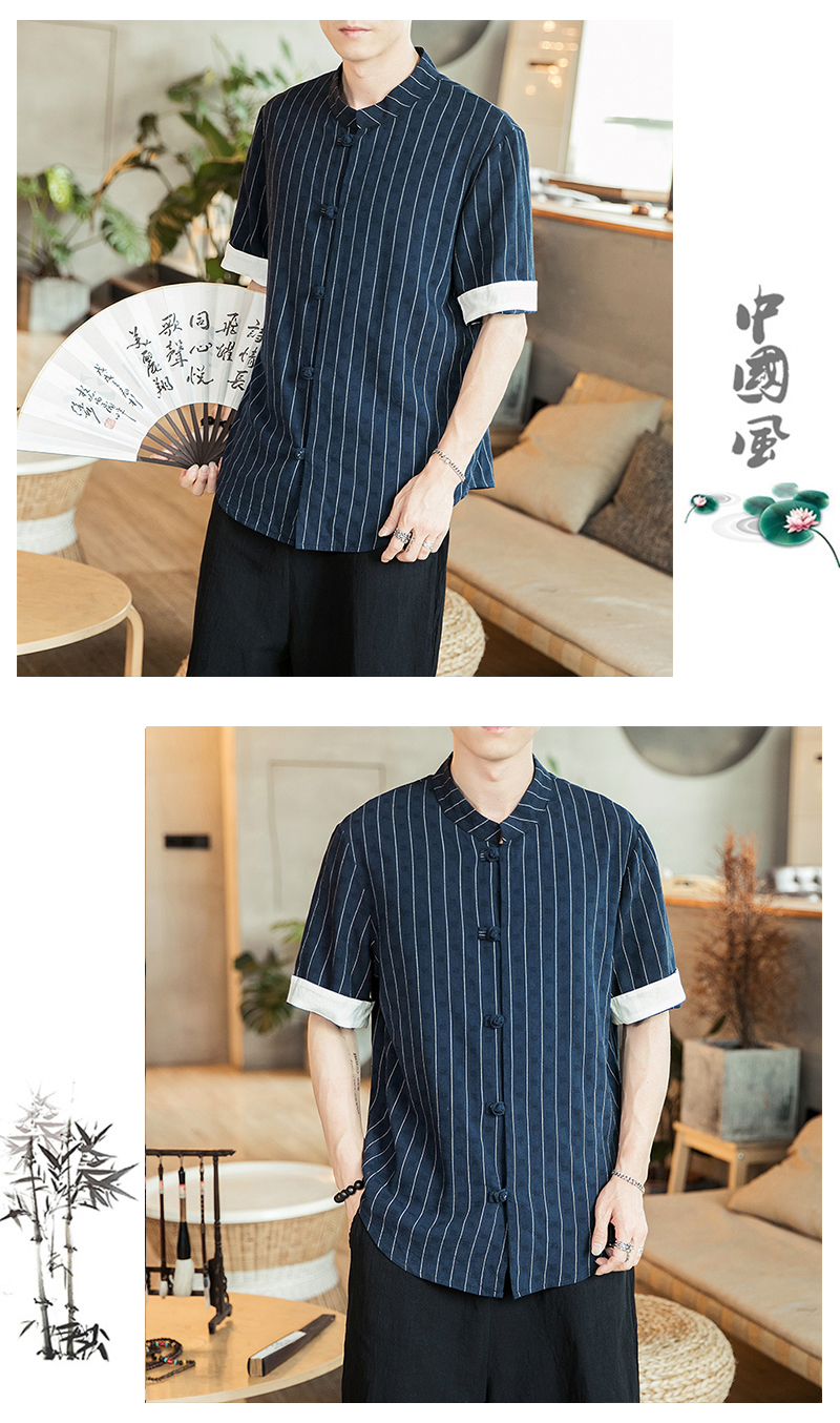 2019 여름 스탠드 칼라 5 점 반팔 스트라이프 셔츠 남자의 중국 스타일 버클 플러스 사이즈 린넨 캐주얼 셔츠스토어 가기