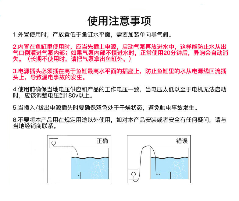 本增氧泵使用前请认真阅读详情,防止操作不当。请插电出气后再放入,插头一定要高于水平面。