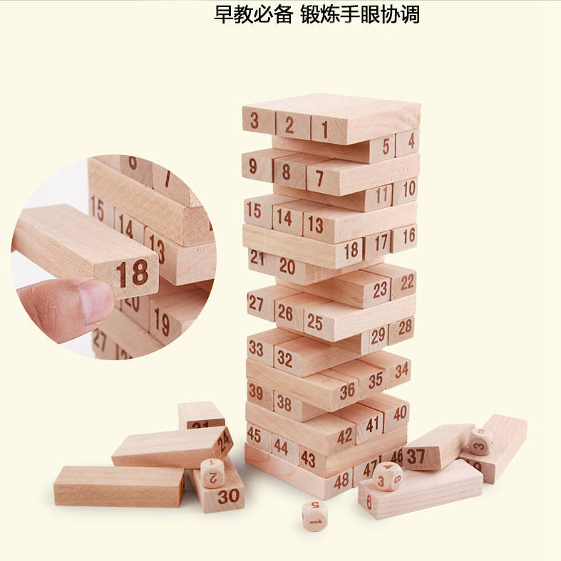 抛骰子决定,拿多少粒骰子自己决定,丢出的颜色,加、减、乘、除由别人决定(但必须在抛前决定),得出的总和颜色对应哪个木块,就把那个木块取出堆放在上面。玩家轮流,谁先把木块堆弄倒谁算输,抽完后再叠加上去,谁让建筑物倒塌即算输家。(注意:您必须只能用一只手)。
