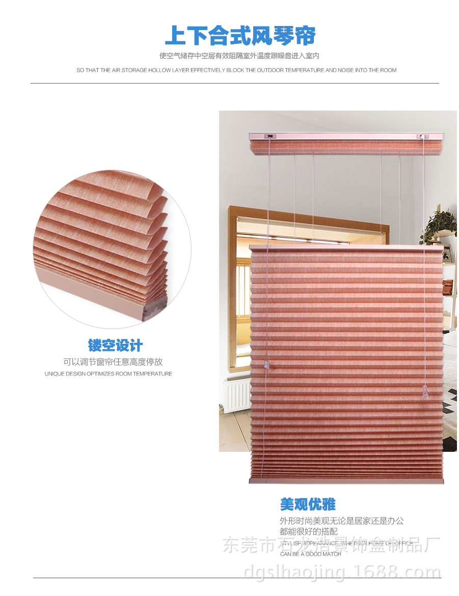蜂巢帘,的蜂巢设计,使空气存储中空层,令室内保持恒温,可节省空调电费。其防紫外线和隔热功能有效保护家居用品,防静电处理,洗涤容易。