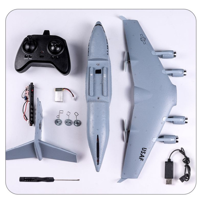 产品附带配件明细: "彩盒包装*1、机体、机翼*1套 机翼装饰1套、胶水*1根, 遥控器*1、说明书*1、电池*1 接收板主板*1、 电机+桨叶*2 USB充电线*1
