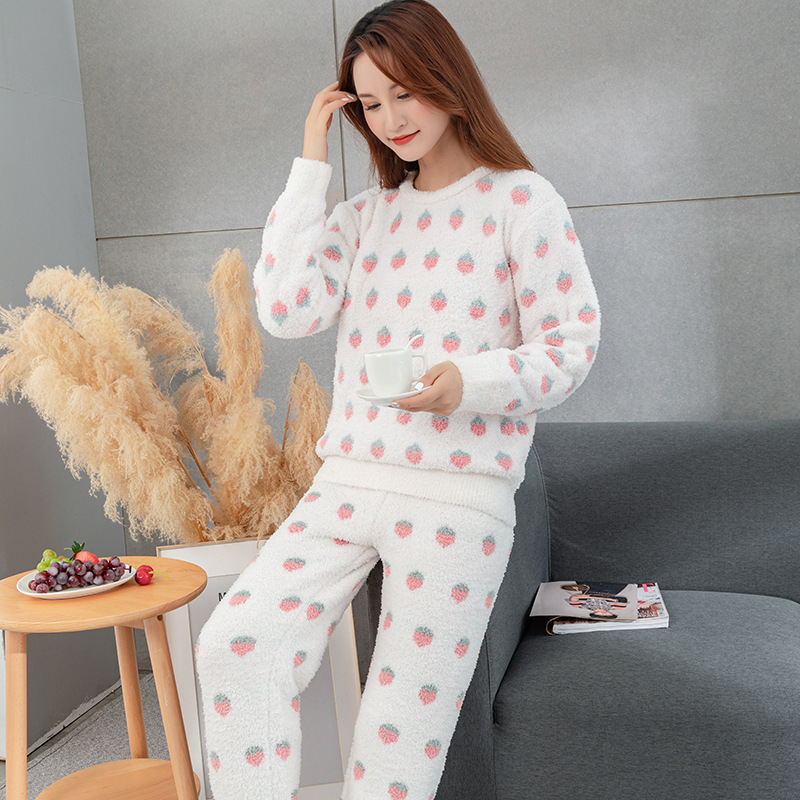 일본식 부드러운 잠옷 여자의 가을과 겨울 귀여운 딸기 겨울 여자의 따뜻한 임신 한 여자의 가정 옷 세트 부모 자식 스타일스토어 가기