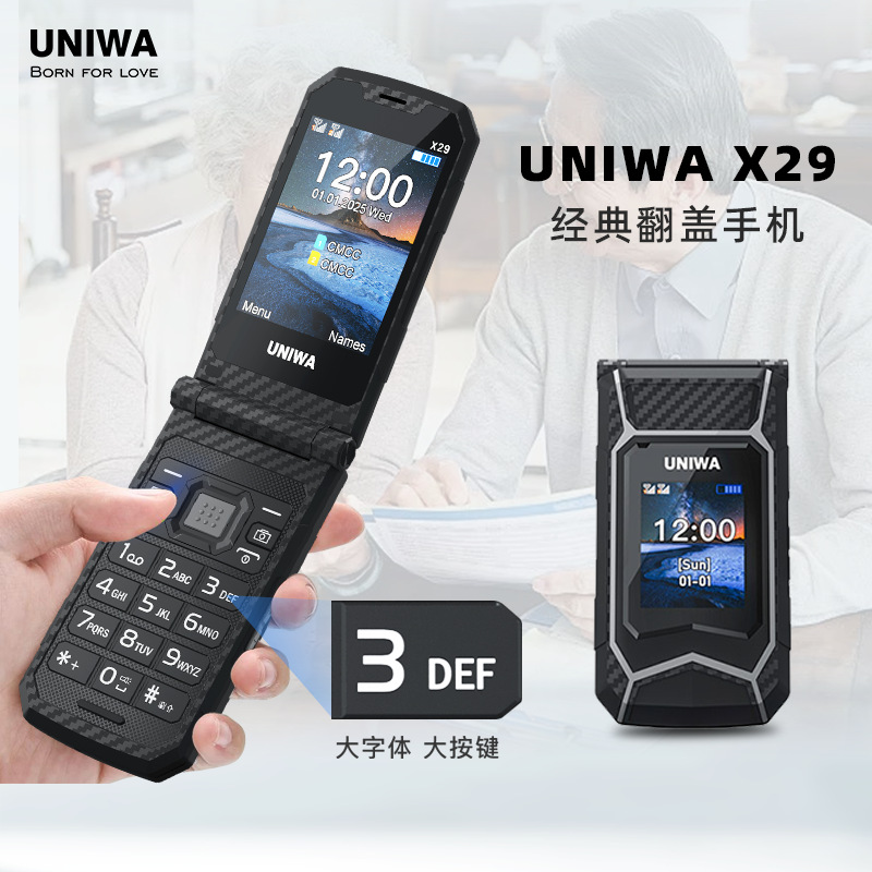 UNIWAX29 2.8英寸双屏双卡GSM坚固风格翻盖手机,大电池