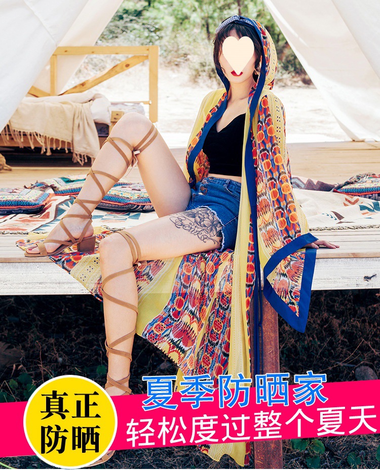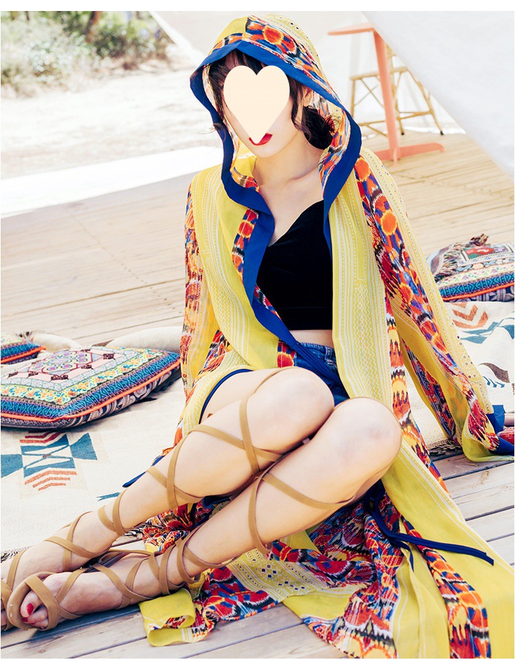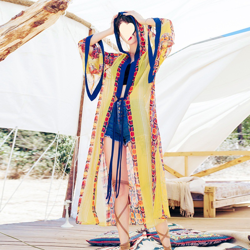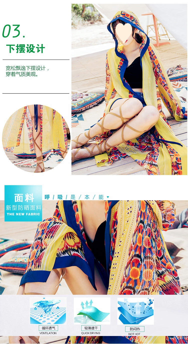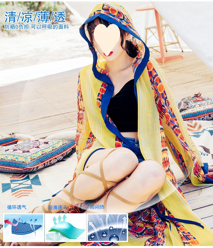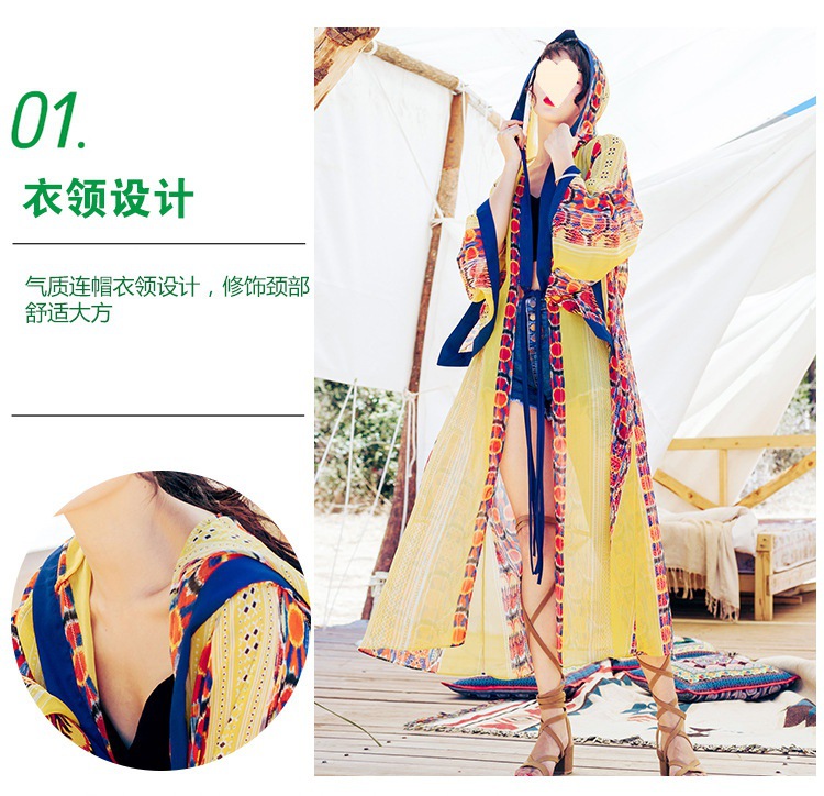 태국 해변 휴가 에스닉 스타일 쉬폰 인쇄 후드 선 스크린 느슨한 큰 소매 요정 우아한 긴 가디건스토어 가기