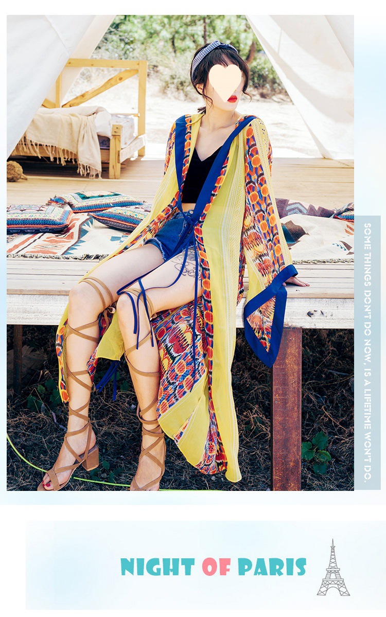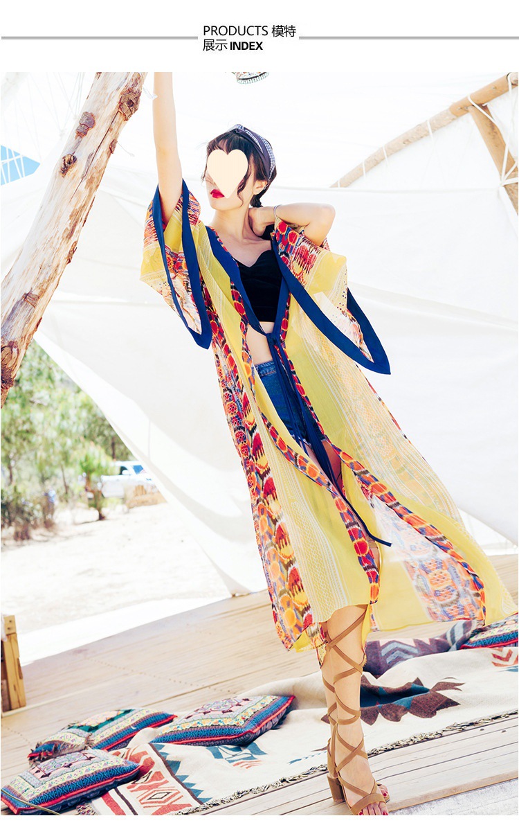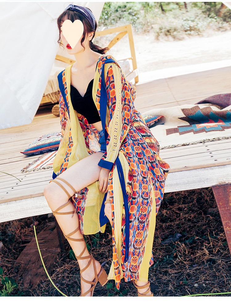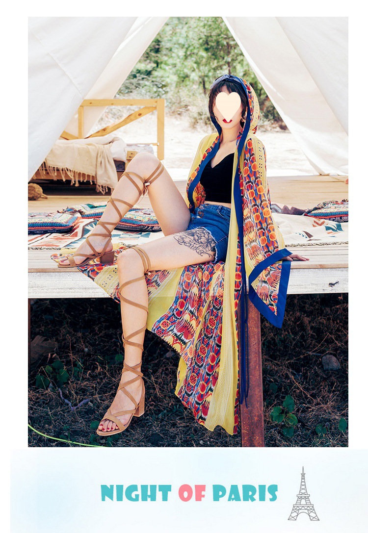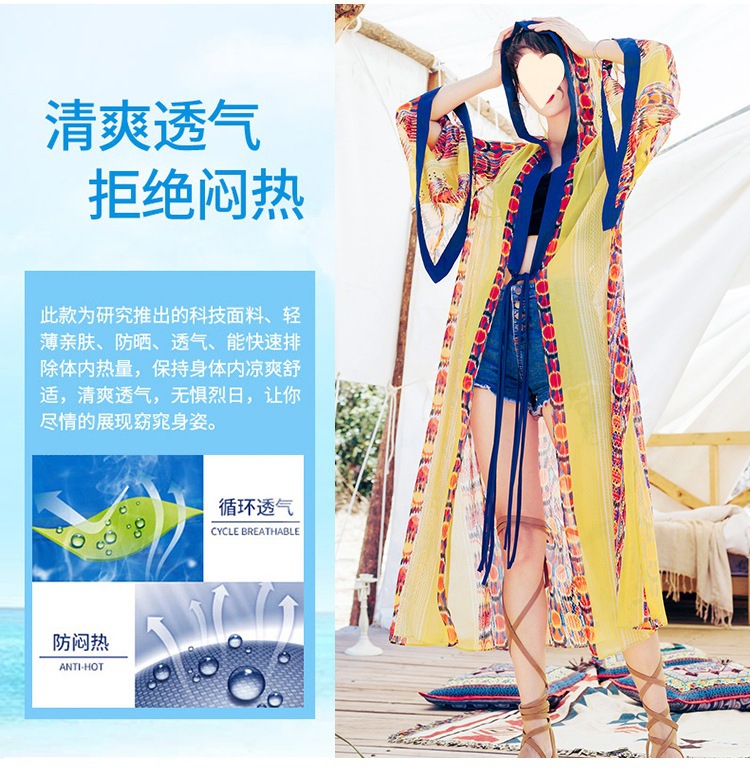 태국 해변 휴가 에스닉 스타일 쉬폰 인쇄 후드 선 스크린 느슨한 큰 소매 요정 우아한 긴 가디건스토어 가기