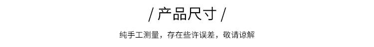 4、关于尺寸、色差: 商品尺寸为手工测量,会有1-2厘米的误差,介意勿拍!商品照片是由专业的摄影师拍摄,图片在处理过程中要求尽量不失真,但因拍摄光线,显示器的色值偏差及个人对颜色的理解程度不同,实物和图片会有一定程度的色差, 此情况实属难免,最终颜色以商品实物为准。
