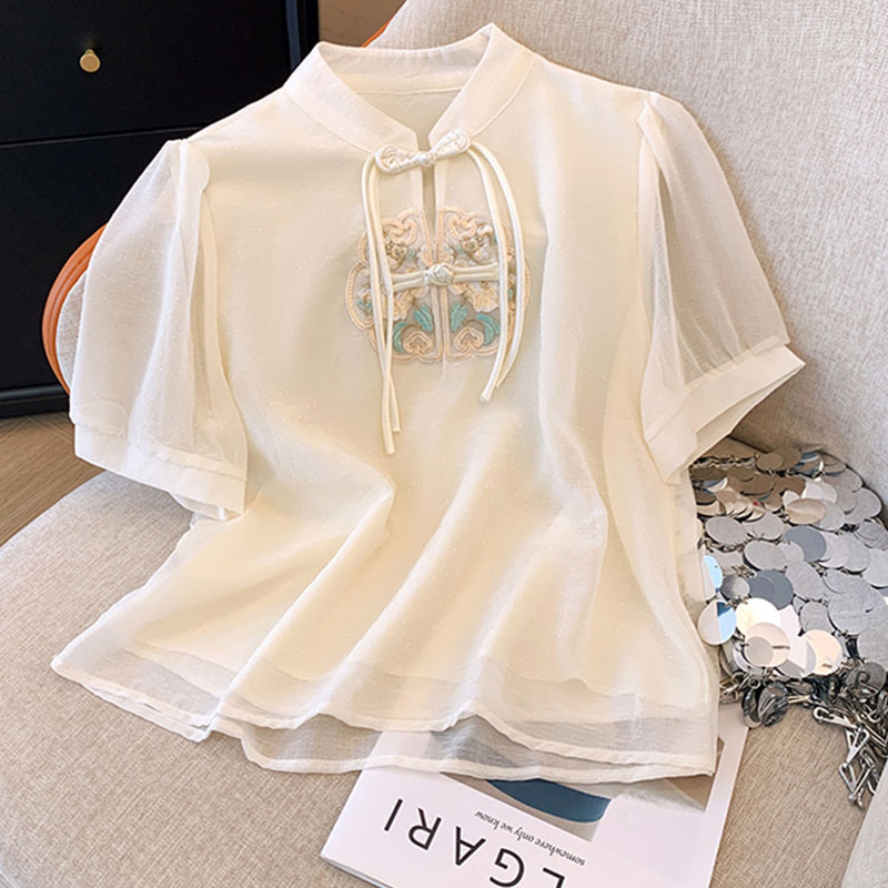 빈티지 Guofeng 수직 칼라 버튼 자수 아플리케 쉬폰 셔츠 여성의 여름 우아한 나이 감소 셔츠 새로운 중국 스타일 탑스토어 가기
