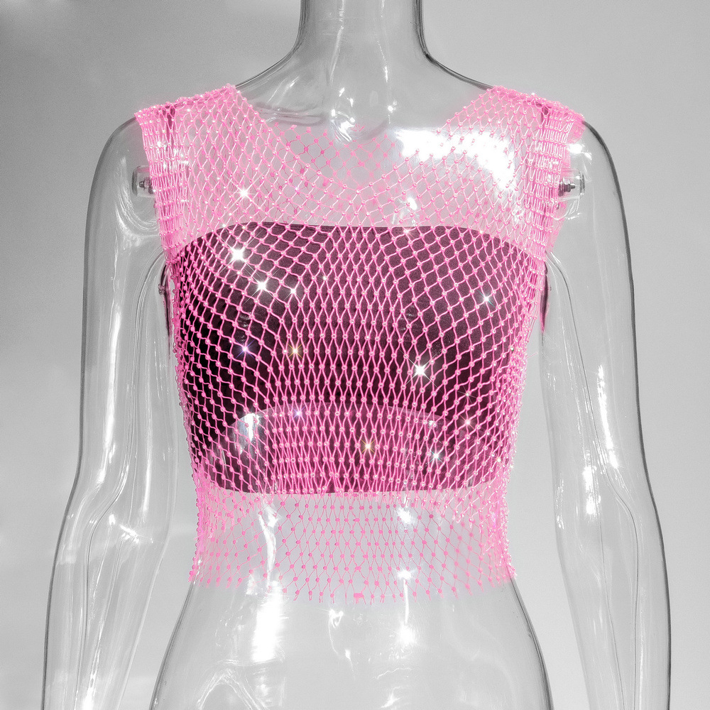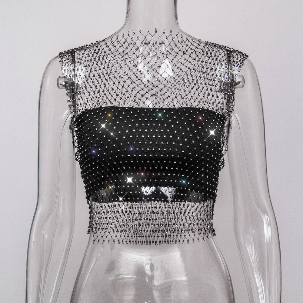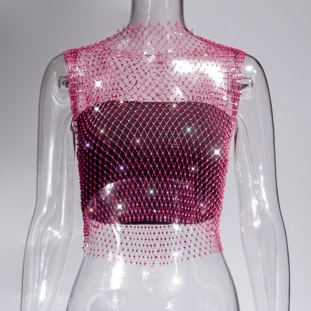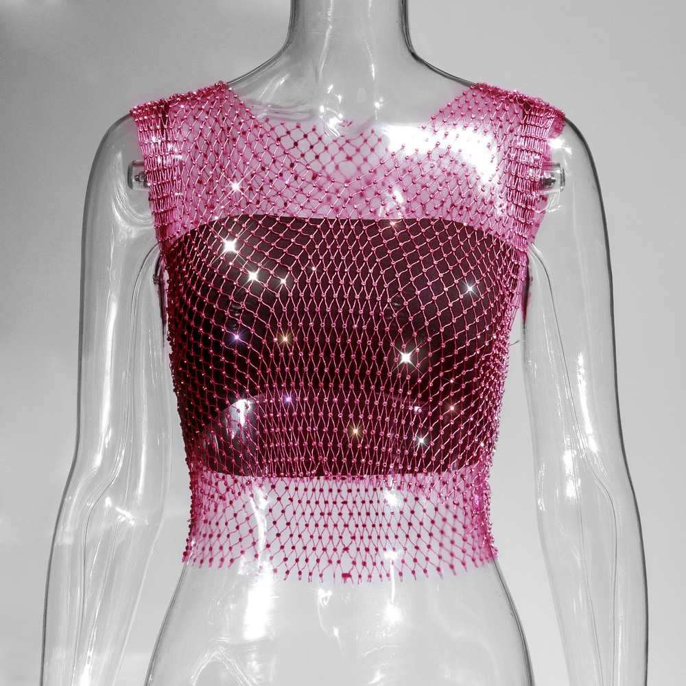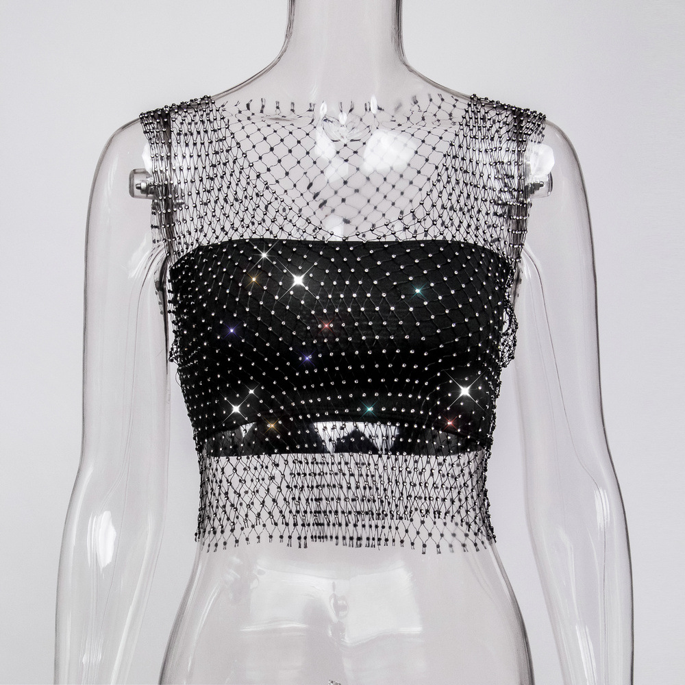 라인스톤 피쉬넷 탑 유럽과 미국 여름 아마존 뉴 메쉬 다이아몬드 플래시 다이아몬드 여성 반팔 조끼스토어 가기