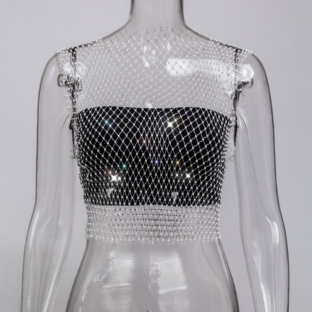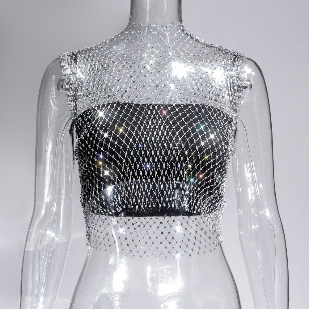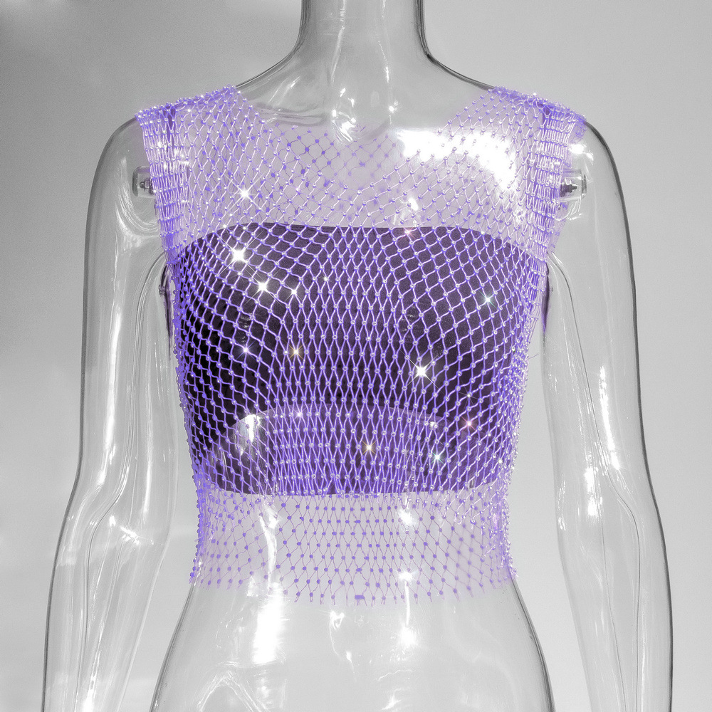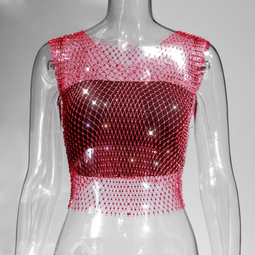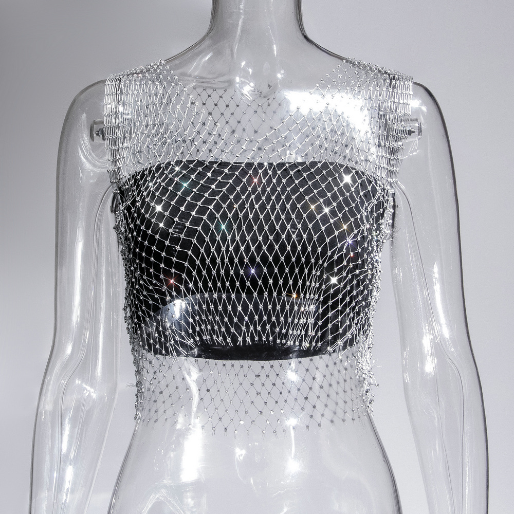 라인스톤 피쉬넷 탑 유럽과 미국 여름 아마존 뉴 메쉬 다이아몬드 플래시 다이아몬드 여성 반팔 조끼스토어 가기