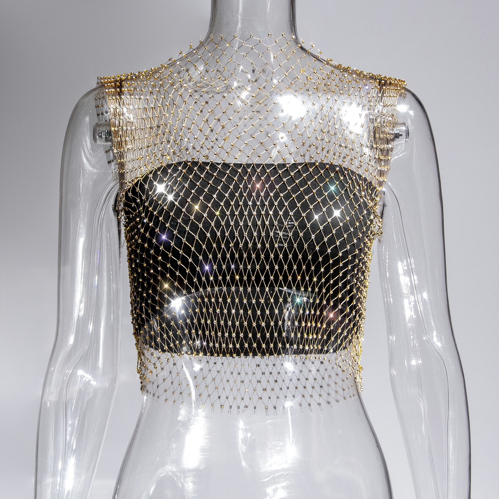 라인스톤 피쉬넷 탑 유럽과 미국 여름 아마존 뉴 메쉬 다이아몬드 플래시 다이아몬드 여성 반팔 조끼