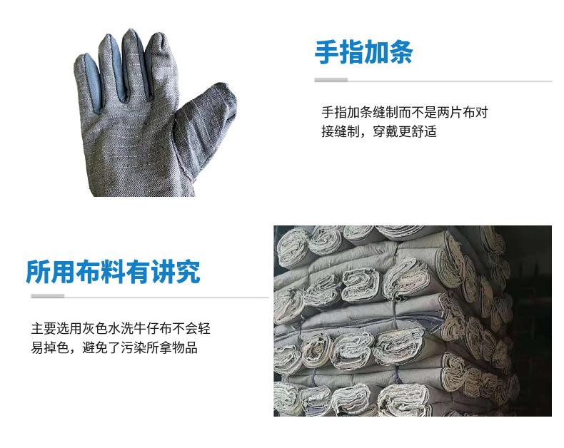 温馨提示:根据所用布料的差别,牛仔布手套分为A、B两个规格