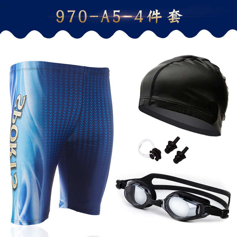 남성용 수영복 장비 전문 트렌디 남성용 플랫 앵글 5 점 수영 트렁크 수영 고글 수영 모자 코 클립 귀마개 4 종 세트