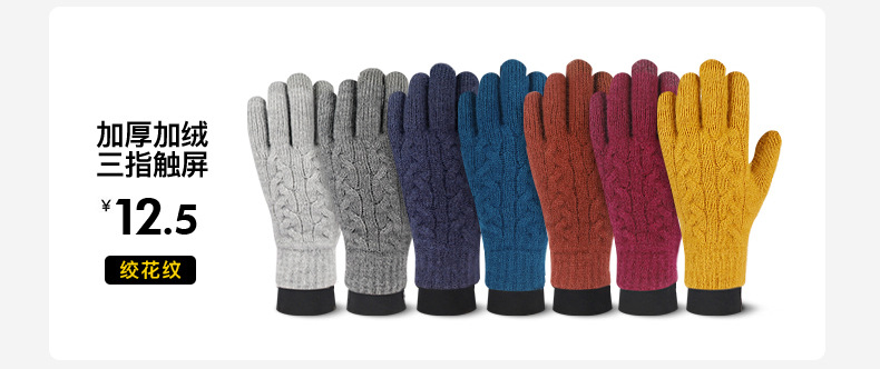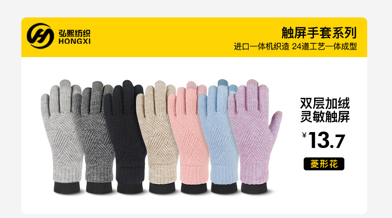 2024冬季爆款日系毛线针织格子手套加绒加厚骑车五指触屏保暖手套