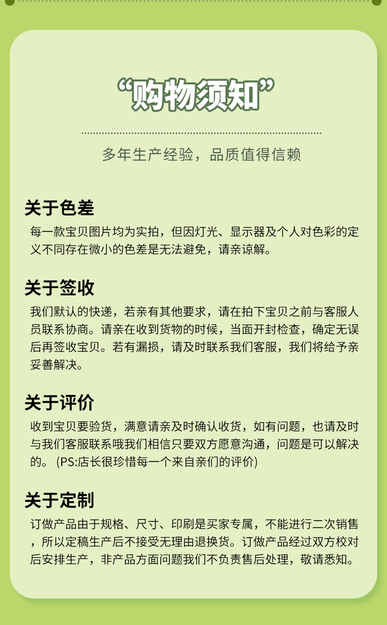 (4)买家收到货物时,送货员在场时,请查看包裹内货物是否完好,再签字,若签完字,既表示货物完好,若发现包裹内有损坏,请及时向送货员反应,验收之后发生问题,概不负责;谢谢配合。