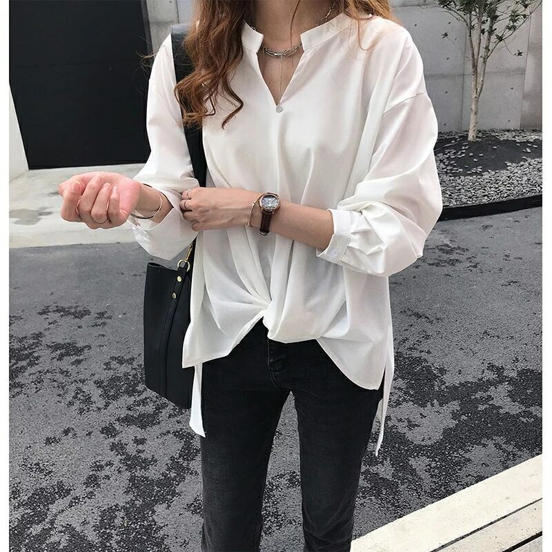 여성용 2021 새로운 심플 엘레강트 쉬폰 셔츠 여성용 긴팔 탑 루즈한 BF 셔츠 베이스 셔츠스토어 가기