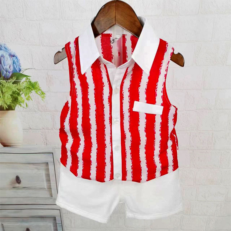 소년 여름 민소매 셔츠 영국 스트라이프 쉬폰 세트 2-7 세 어린이 캐주얼 조끼 반바지 투피스 세트