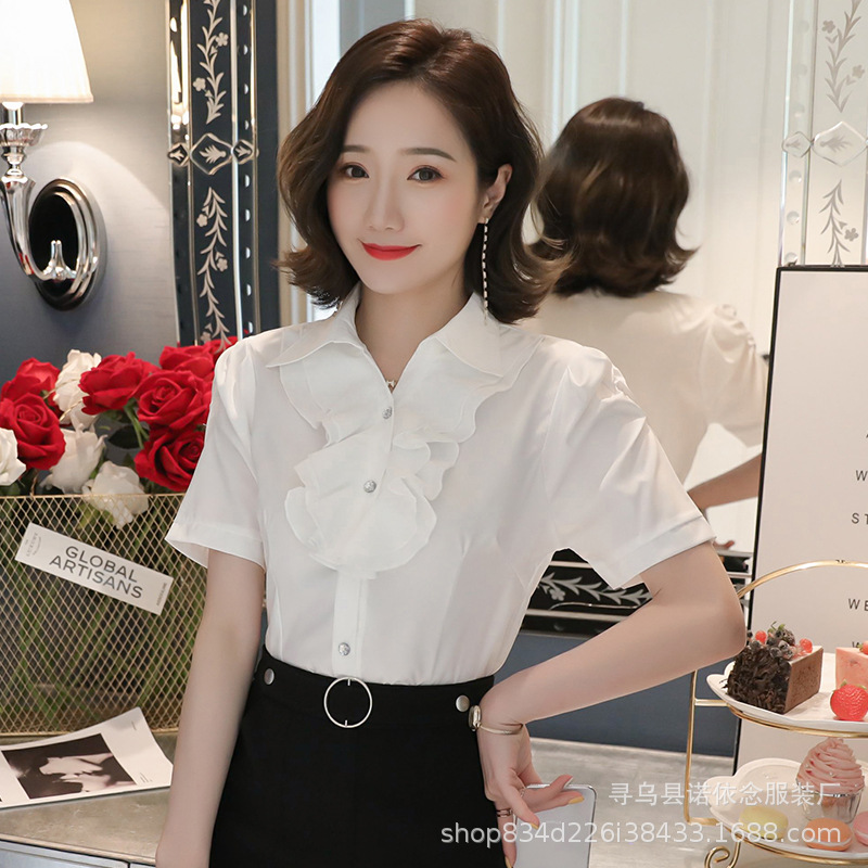 여성을위한 로터스 리프 레이스가 달린 새로운 여성 의류 한국 스타일 봄과 여름 흰색 반팔 셔츠 전문 슬림핏 OL 셔츠스토어 가기
