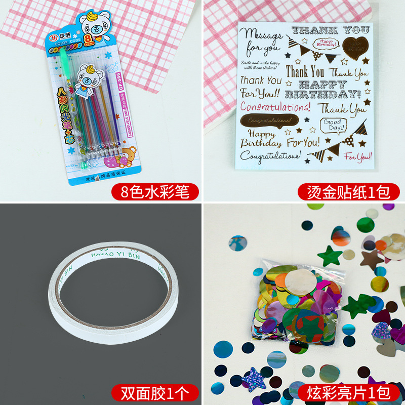 弹跳配件礼包:烫金贴纸1张(贴纸随机)+双面胶1个+八色水彩笔1套+炫彩亮片1包
