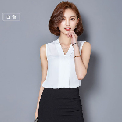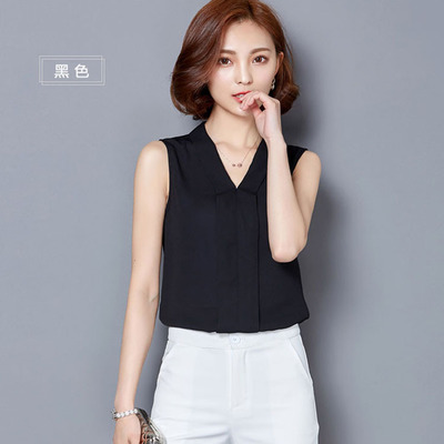2019 여름 쉬폰 셔츠 여성용 민소매 V-넥 플러스 사이즈 슬림 모든 매치 베이스 여성용 탑 셔츠 공장 아울렛스토어 가기