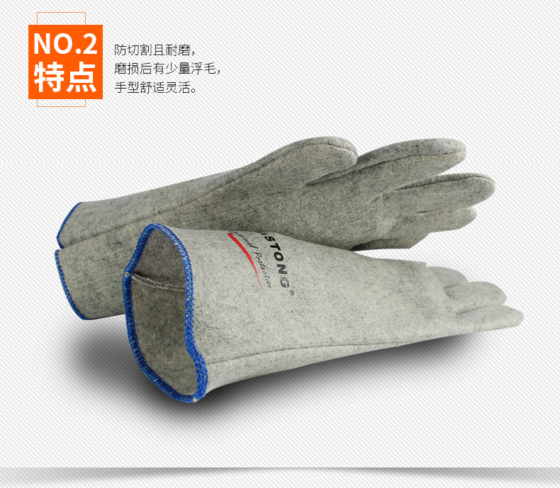 手掌主要面料为对位芳纶高温隔热毡布,耐磨损、防切割,耐温300度,每次持续时间20-30秒,磨损后有少量浮毛。