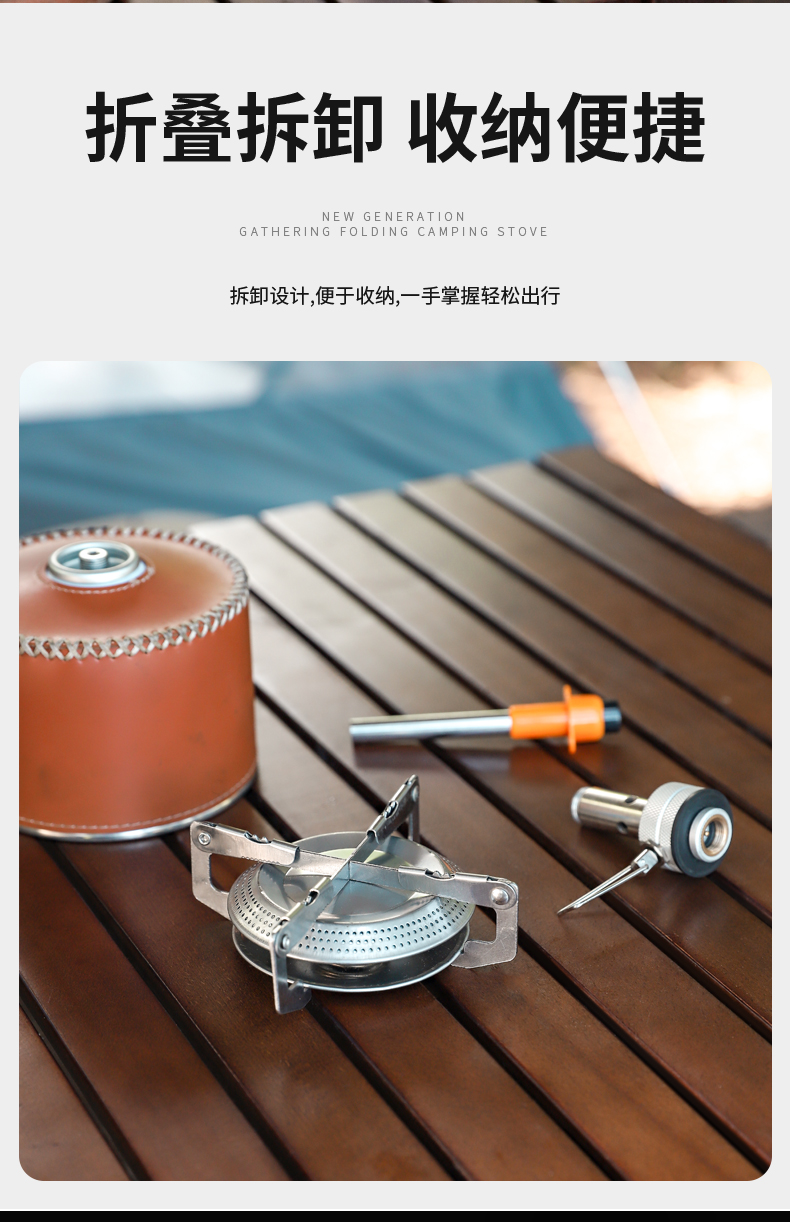 最小、最便利的设计正在改写便携式炉具历史,喷枪式强火,设计大大减少您的等待时间,折叠式托架和火力调节阀有效减小体积方便您的出行。