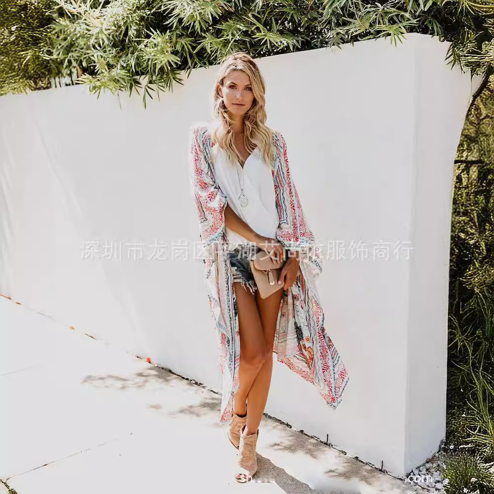 2017 AliExpress 아마존 유럽과 미국의 디지털 포지셔닝 인쇄 긴 카디건 비키니 비치 블라우스스토어 가기