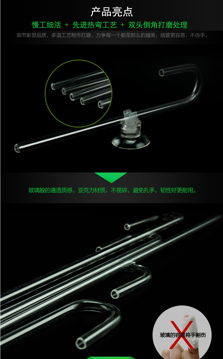 用途:水草缸内安装细化器气管弯曲导致出气不顺畅,U形管可防止气管弯曲,美观大方,靓丽通透