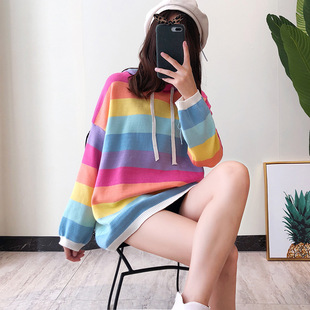慵懒风毛衣女2019秋冬新款韩版宽松中长款彩虹连帽针织衫女装卫衣