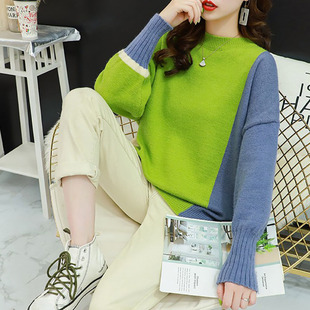 2019新款韩版拼色慵懒风毛衣女外套宽松套头灯笼袖懒惰风毛衣外穿