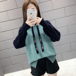 2019秋冬新款拼色连帽针织衫卫衣韩版长袖带帽毛衣女套头短款宽松